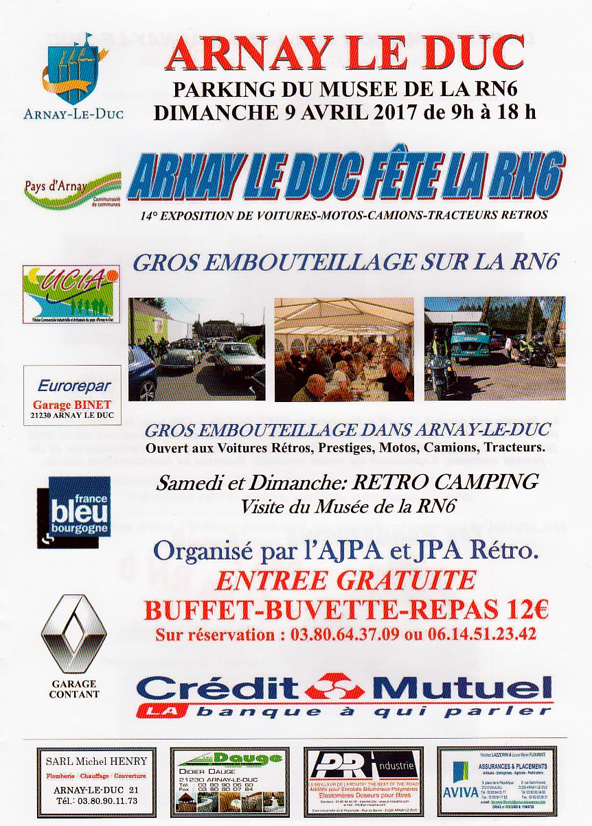Dimanche 9 avril 2017 ARNAY LE DUC GROS EMBOUTEILLAGE SUR LA RN 6 dans la matinée. Rendez vous au parking du musée pour 9H00 pour les voitures anciennes et les motos, passage en ville et sur l'ancienne RN 6. Dejeuner ( 12 € sur réservation ) sous chapiteau à midi. L'après midi 2 circuits RN 6 et environs d' ARNAY. Visites du musée toute la journée, rétro camping samedi et dimanche sur le site pour ceux qui font les 2 journées avec nous.